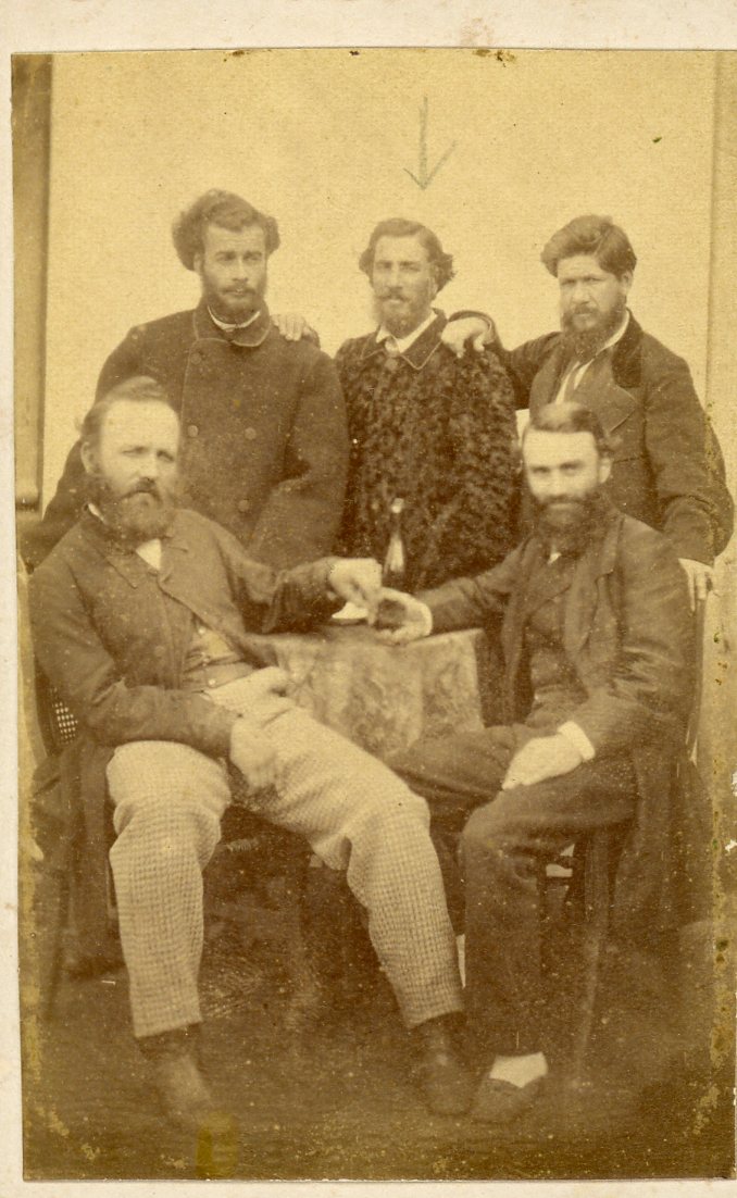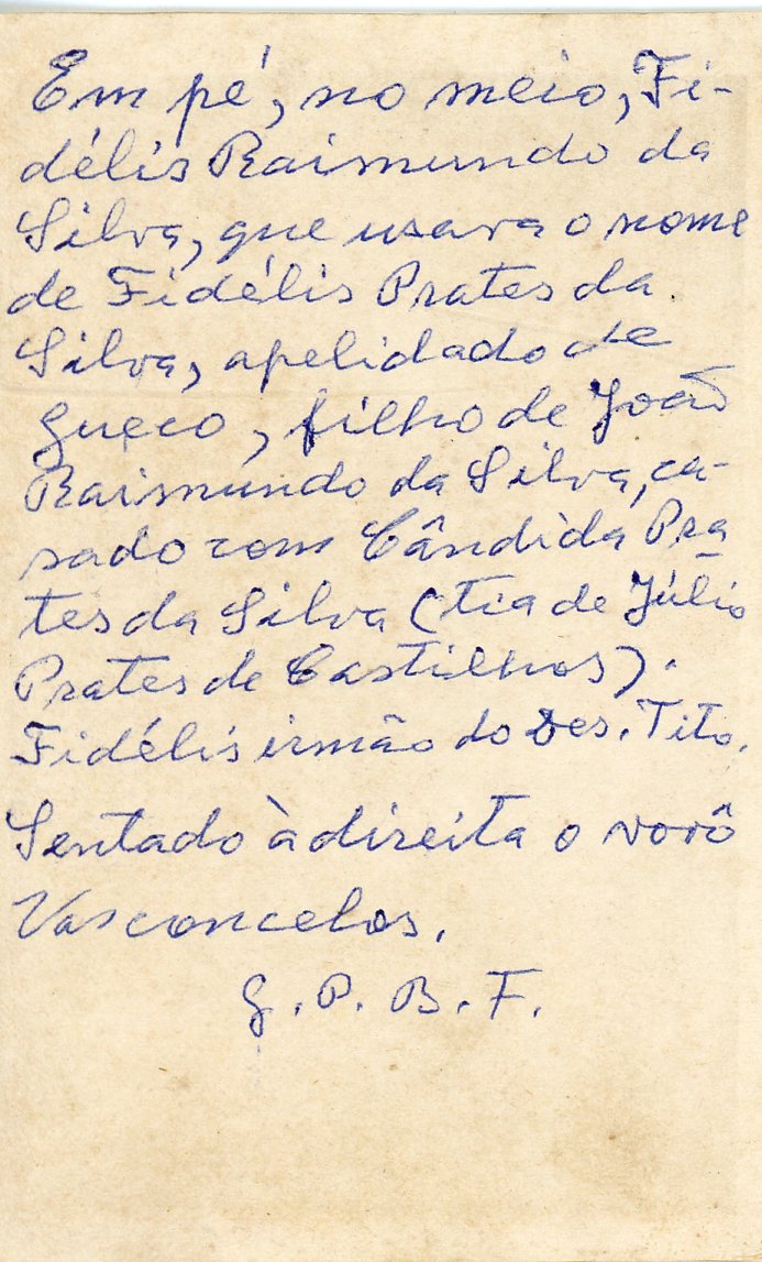 No verso consta a inscrição, "Em pé, no meio, Fidélis Raimundo da Silva, que usava l nome de Fidélis Prates da Silva, apelidado de Gueco, filho de João Raimundo da Silva, casado com Cândida Prestes da Silva(tia de Júlio Prates de Castilhos). Fidélis irmão do Des. Tito. Sentado à direita o vovô Vasconcelos.